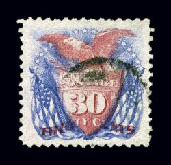 205 O 121 image#121, 30c Blue and carmine, a lovely used example in a condition that is quite infrequently found, possessing exceptional centering within unusually large margins, plus its colors are wonderfully strong and its impressions highly detailed on bright paper, neat strike of a petite quartered cork pmk., extremely fine; 1992 PSE certificate; ex-"Ganymede". (Image) $550.00