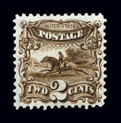 211 og 124 image#124, 2c Brown re-issue, a highly desirable mint single, with outstanding centering amid large margins, deep rich re-issue color and impression, full o.g., lightly hinged, extremely fine; actually a rare stamp in this impressive quality; 1967 and 2000 PF certificates. (Image) $800.00