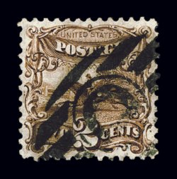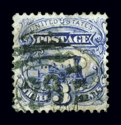 213 O 125 image#125, 3c Blue re-issue, an extremely rare used example, deep color and a crisp impression, duplex cancel with numeral "29" in oval of bars and portion of New York c.d.s. consistent with genuine used examples, a couple of thin spots as is often the case as nearly all used example have faults to some degree, fine appearance; one of the rarest United States 19th century stamps to find in used condition, as less than fifteen examples are recorded; the catalog value quoted in Scott is for "an attractive fine-very fine example with minimal faults"; 1998 PF certificate; ex-Twigg-Smith, "Ganymede". (Image) $22,500.00
