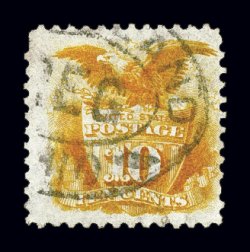 214 O 127 image#127, 10c Yellow re-issue, a select used single of this re-issue, being quite well centered amid large margins, sumptuously rich color and impression on fresh white paper, plus an excellent strike of a Cleveland, Ohio registry double oval postmark, very fine and choice; far more difficult to find used than mint, especially in this premium quality; 1977 PF certificate; ex-"Ganymede". (Image) $1,750.00