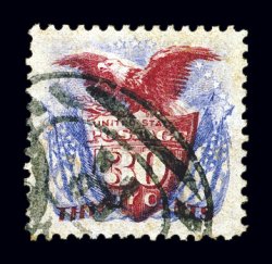 204 O 121 image#121, 30c Blue and carmine, a striking jumbo-margined used example, with extravagantly large margins all around and being incredibly well centered within them, gorgeous rich colors and strong highly detailed impressions on fresh paper, very lightly cancelled, extremely fine; not often seen in this gem used condition; 1984 PF certificate. (Image) $550.00