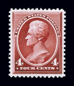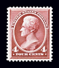 266 nh 215 image#215, 4c Carmine, a marvelous pristine mint single, possessing an overall freshness and crispness which belies its age, with sumptuously rich color and prooflike impression on bright paper, very nearly perfectly centered within uncommonly large margins, immaculate o.g., never hinged, extremely fine; a true "post office" fresh gem; 1991 PF certificate. (Image) $700.00
