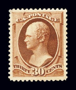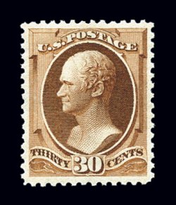 269 nh 217 image#217, 30c Orange brown, a highly desirable mint example in a true "post office" condition, possessing an exceptional overall freshness, with sumptuously rich color and impression on crisp paper, marvelously well centered, with unusually large margins all around, unblemished o.g., never hinged, extremely fine; while premium quality #217's can be found, few are encountered in this gem never hinged condition; 2003 PF certificate. (Image) $1,350.00
