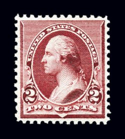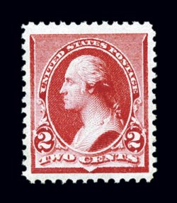 277 og 220c image#220c, 2c Carmine, cap on both "2's" variety, an exceptionally choice mint example of this scarce and popular variety, wonderfully well centered within uncharacteristically large margins, deep luxuriant color, o.g., lightly hinged, extremely fine; seldom offered in this premium condition; 1982 PF certificate. (Image) $700.00