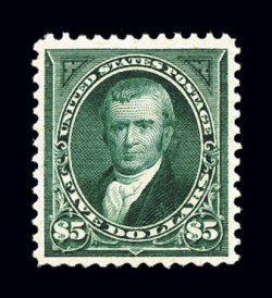 361 og 278 image#278, $5.00 Dark green, a magnificent mint single of this truly scarce and sought-after high value, being extraordinarily well centered amid uncommonly large margins, deep luxuriant color and prooflike impression, wonderfully fresh when compared to most, with full clean o.g. showing only the slightest trace of a hinge mark, extremely fine; 1997 PF certificate. (Image) $2,300.00