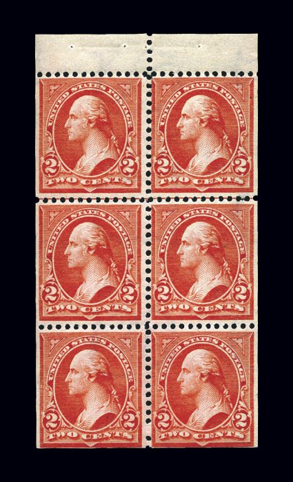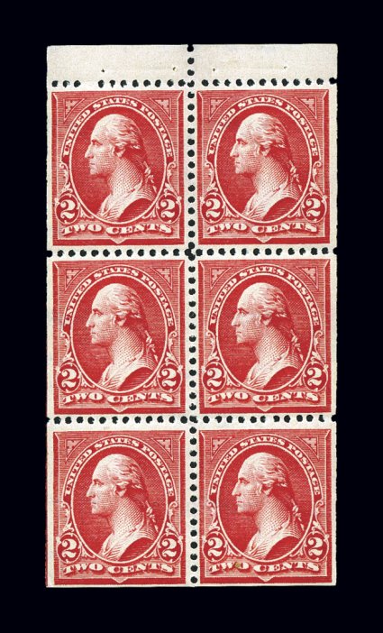 365 ogBP 279Be image#279Be, 2c Light red, Ty. III, booklet pane of six, exceptionally well centered, strong rich color in the distinctive light red shade, o.g., lightly hinged, small natural inclusion in the bottom right stamp, very fine. (Image) $425.00
