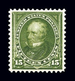 376 nh 284 image#284, 15c Olive green, a magnificent quality mint example of this surprisingly challenging stamp, possessing outstanding physical attributes, including being virtually perfectly centered within uncharacteristically large margins, sumptuously rich color and a deeply etched impression on brilliantly fresh paper, unblemished o.g., n.h., an extremely fine gem in all respects; currently this is the highest graded example of Scott #284 in the PSE population report; 2001 PF certificate and a 2005 PSE certificate (XF- Superb 95); ex-Jarrett. (Image) $400.00