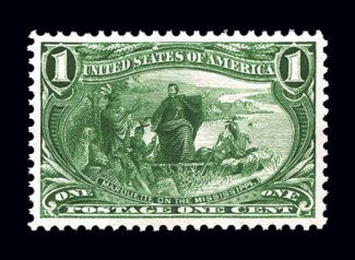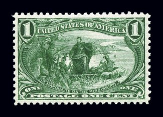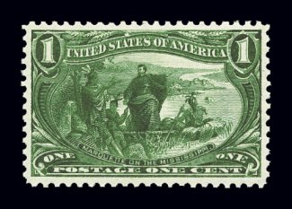 378 nh 285 image#285, 1c Trans-Mississippi, exceptional mint single, gloriously rich color and a razor-sharp impression, large wonderfully well balanced margins all around, o.g., n.h., extremely fine; an immaculate gem; 1992 PF certificate and a 2005 PSE certificate (XF-Superb 95); ex-Jarrett. (Image) $70.00