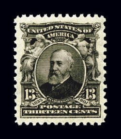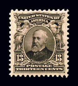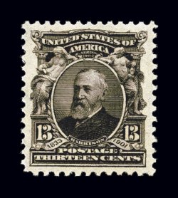 434 nh 308 image#308, 13c Purple black, a magnificent mint single that is precisely centered within incredibly large and perfectly balance margins, plus it possesses deep intense color and an especially strong impression, unblemished o.g., n.h., extremely fine; an impressive gem for the most fastidious collector; easily one of the finest quality singles we have ever offered of this value; 1992 PF certificate and a 2005 PSE certificate (XF-Superb 95 Jumbo); ex-Jarrett. (Image) $110.00