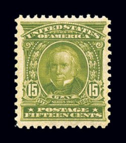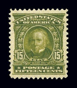 437 nh 309 image#309, 15c Olive green, a fabulous quality mint example which possesses tremendous eye appeal, being perfectly centered amid large margins, gloriously rich color and a well defined impression on immaculate paper, unblemished o.g., n.h., an extremely fine gem in every regard; currently this is one of only two never hinged #309's to have been graded "XF-Superb 95" by the PSE; 1987 PF certificate and a 2005 PSE certificate (XF-Superb 95); ex-Jarrett. (Image) $450.00