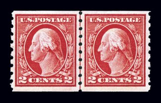 546 nh 413 image#413, 2c Carmine coil, Ty. I, perf. 8 1/2 vert., guide line pair, uncharacteristically well centered within large margins, prooflike color and impression, o.g., n.h., extremely fine; an especially scarce line pair in this choice condition; 1986 PF certificate. (Image) $625.00