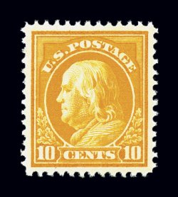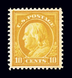 551 nh 416 image#416, 10c Orange yellow, choice mint single, excellent centering within exceptionally large margins, wonderfully fresh with especially dark color, flawless o.g., n.h., extremely fine; 2003 PF certificate. (Image) $100.00