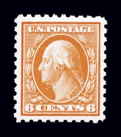 564 nh 429 image#429, 6c Red orange, top left corner sheet-margin single, with extra-large selvage, very well centered within lavishly large margins, gorgeous bright color, o.g., n.h., extremely fine and striking. (Image) $105.00