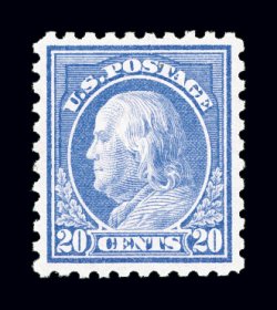575 nh 438 image#438, 20c Ultramarine, incredibly well centered, bright fresh color, o.g., n.h., extremely fine; a terribly scarce stamp to find both this choice and never hinged; 1998 PF certificate. (Image) $475.00
