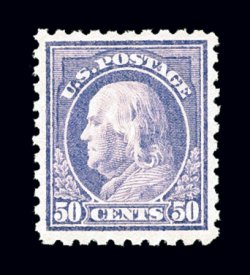 578 nh 440 image#440, 50c Violet, Q a remarkable example of this scarce and difficult value, being the beneficiary of not only exceptionally choice centering but large margins as well, deep rich color on fresh bright paper, and its perforations are uniformly even and intact, flawless o.g., n.h., extremely fine; a particularly rare stamp in this gem never hinged quality; 2003 PSE certificate. (Image) $1,300.00