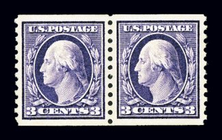 580 nh 445 image#445, 3c Violet flat plate coil, perf. 10 vert., a superb mint pair, being incredibly well centered amid very large margins, prooflike color and impression on marvelously fresh paper, pristine o.g., n.h., extremely fine; a gem coil pair for the perfectionist. (Image) $1,250.00