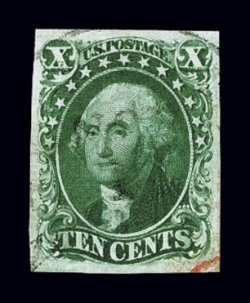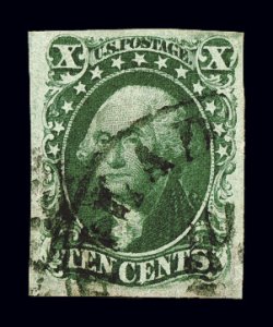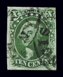 42 O 15 image#15, 10c Green, Ty. III, used with portions of both San Francisco and New York c.d.s. pmks., especially deep color, four full to large margins, very fine; ex-"Ganymede". (Image) $200.00