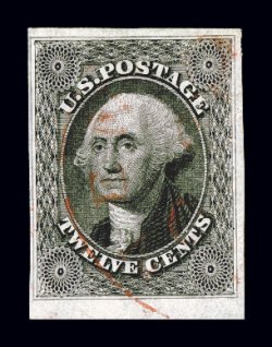 47 O 17 image#17, 12c Black, highly select used single, possessing four large to extra-large margins, including a partial sheet margin at bottom, strong color and an unusually crisp clean impression on bright paper, attractive light town c.d.s. in red, extremely fine and an especially handsome stamp; 2002 PF certificate; ex-"Ganymede". (Image) $345.00