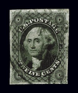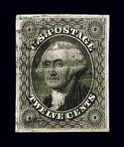 49 O 17 image#17, 12c Black, used, four uncharacteristically large and symmetrical margins, which are not often seen on this tightly spaced stamp, strong fresh color and an unusually clean impression, lightly cancelled, extremely fine. (Image) $325.00