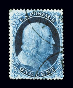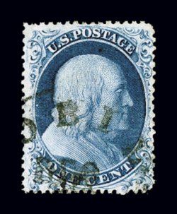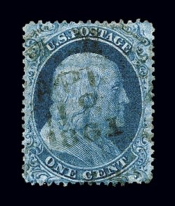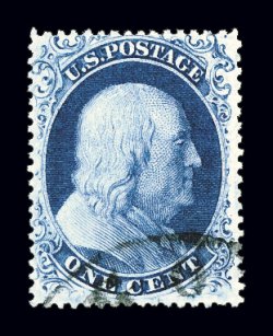 50 O 18 image#18, 1c Blue, Ty. I, virtually perfectly centered within uncharacteristically large margins, bright rich color distinctive to stamps from Plate 12, light central strike of an 1861 year date c.d.s., extremely fine; seldom encountered so well centered and margined; 1986 PF certificate. (Image) $650.00