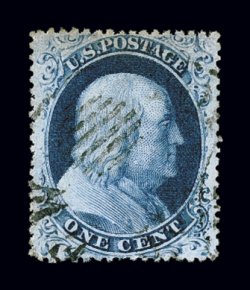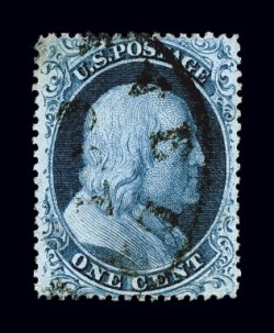 51 O 19 image#19, 1c Blue, Ty. Ia, position 92R4, an incredibly select used example of this rare and enormously challenging stamp to find in any kind of collectable quality, boasting outstanding centering amid far larger margins than typically associated with this, in fact its design nearly clears the perforations all around which is a very rare occurrence, rich luxuriant color and a clean well defined impression so that the Type Ia characteristics show clearly, neat and unobtrusive town c.d.s., extremely fine; a rare opportunity to acquire a terribly elusive stamp in outstanding quality; 1998 PF certificate; ex-McKinney. (Image) $9,000.00