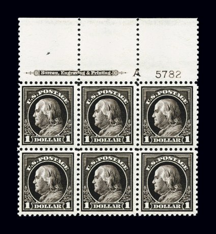 663 nhPB 518 image#518, $1.00 Violet brown, a wonderfully fresh and choice full top margin imprint, "A" and plate no. 5782 block of six, possessing eye-arresting prooflike color and impression on crisp white paper, very well centered as well, o.g., never hinged, overall extremely fine and a most desirable example of this scarce high value plate block; 1997 PF certificate. (Image) $2,100.00