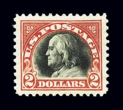 666 nh 523 image#523, $2.00 Orange red and black, an incomparable mint example of this scarce and popular stamp, being the only example to be graded by the PSE as "Gem 100" - the ultimate condition for any stamp, possessing an impressive overall brilliance and freshness which is quite extraordinary, with strong rich colors devoid of even a hint of oxidization which often affects the orange red color, even its paper is unusually bright, but most impressive is its absolutely perfect centering amid huge jumbo margins, pristine o.g., n.h., superb; a stamp that is destined to realize a record price, and deservedly so, as this incredible stamp is among a very small fraternity whose condition simply cannot be improved upon; recently featured on the front cover of the Oct - Dec 2005 edition of the Stamp Market Quarterly published by Collectors Universe; 1997 PF certificate and a 2005 PSE certificate (Gem 100); ex-Vreeland, Jarrett. (Image) $1,300.00