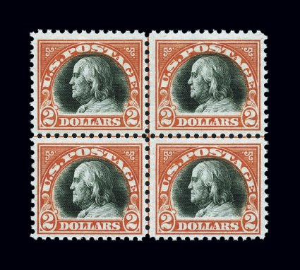 669 nhbl 523 image#523, $2.00 Orange red and black, center line block of four, wonderfully bright and fresh, o.g., never hinged, very fine; center line blocks of #523 are extraordinarily difficult to find; unpriced in never hinged condition, therefore cataloged as four singles. (Image) $5,200.00