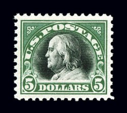 670 nh 524 image#524, $5.00 Deep green and black, a magnificent mint example of this high value, possessing mathematically precise centering within unusually large margins, plus its colors are especially rich and fresh, o.g., n.h., a superb gem in every regard; while nice examples of this stamp can be found, scant few are encountered in this stellar quality; 2000 PF certificate and a 2005 PSE certificate (Superb 98); ex-Jarrett. (Image) $425.00