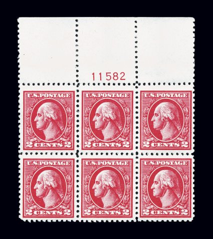 675 nhPB 528 image#528, 2c Carmine offset, Ty. Va, full top margin plate no. 11582 block of six, wonderfully bright and fresh, deep rich color on immaculate paper, outstanding centering, o.g., n.h., extremely fine; ex-Fogelson. (Image) $130.00