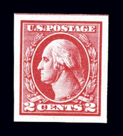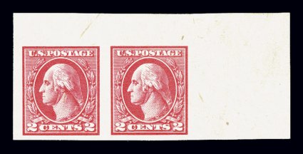 677 og/nh 533 image#533, 2c Carmine offset imperforate, Ty. V, an impressive top right corner sheet-margin horizontal pair, featuring huge sheet selvages and other margins quite large, rich color, o.g., left stamp with barest trace of hinging, right stamp n.h., some natural inclusions and gum bends endemic to the offset issues, extremely fine. (Image) $340.00+