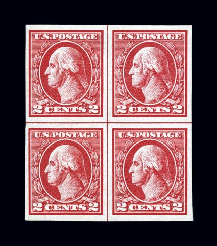 678 nhbl 533 image#533, 2c Carmine offset imperforate, Ty. V, center line block of four, large margins all around, brilliantly fresh, o.g., n.h., small natural inclusion in bottom right stamp not visible on the front, very fine; cataloged as four singles. (Image) $920.00+