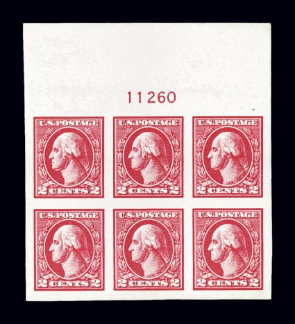 679 nhPB 533 image#533, 2c Carmine offset imperforate, Ty. V, a superb full top margin plate no. 11260 block of six, other three margins exceptionally large and perfectly balanced, radiant color, o.g., never hinged, extremely fine; a truly outstanding example of this scarce plate block; 1987 PF certificate. (Image) $1,800.00