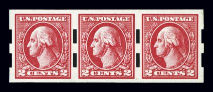 680 nh 533 var. image#533 var., 2c Carmine offset imperforate, Ty. V, Schermack Ty. III perforations, strip of three, unusually well centered, exceptionally bright and fresh, o.g., n.h., extremely fine and uncommonly choice; 1994 PF certificate; cataloged as a hinged pair. (Image) $350.00+