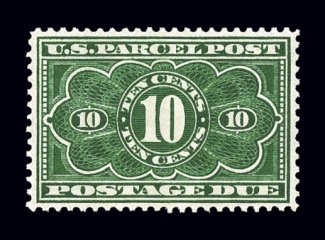 869 nh JQ4 image#JQ4, 10c Parcel Post Postage Due, incredibly well centered, sumptuously rich color, crisp detailed impression, pristine o.g., n.h., extremely fine; 1983 PF certificate. (Image) $400.00