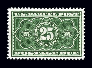 870 nh JQ5 image#JQ5, 25c Parcel Post Postage Due, a gem mint example of this surprisingly challenging stamp to find in premium condition, possessing outstanding centering amid uncharacteristically large margins, gorgeous prooflike color and impression on immaculate paper, o.g., n.h., extremely fine; 1992 PF certificate. (Image) $260.00