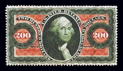 873 O RB10a image#RB10a, $5.00 Green and black on violet paper, remarkable quality used example of this beautiful revenue rarity, large margins with full clean perforations, centered a bit to the left, plus its colors are especially deep and intense, neat central manuscript cancel, tiny and truly insignificant repair at left as the vast majority of this large size revenues have much more severe faults, otherwise very fine for this of which only 74 examples were issued on the violet paper (Image) $8,000.00