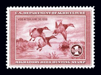 875 nh RW2 image#RW2, 1935 $1.00 Rose lake, an impressive gem mint single, incredibly well centered amid huge margins that are almost unheard of on this key value, brilliantly fresh, deep luxuriant color, pristine o.g., n.h., extremely fine; the perfect stamp for the collector assembling a truly select set of Hunting Permit stamps; 2004 PF certificate. (Image) $700.00