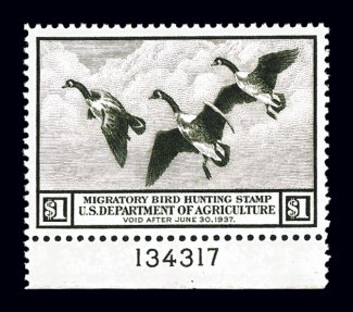 876 nh RW3 image#RW3, 1936 $1.00 Brown black, a gem mint bottom sheet-margin plate no. 134317 single, possessing some unbelievable physical characteristics that rarely are found in one stamp, among them being perfectly centered within amazingly uniform huge margins, also brilliantly fresh with deep color and a razor-sharp impression, pristine o.g., n.h., accompanying certificate mentions tiny natural gum skips, which are both normal and minute, only to explain why the stamp was not given a higher grade, an outstanding extremely fine gem; 2005 PSE certificate (XF-Superb 95 Jumbo). (Image) $350.00