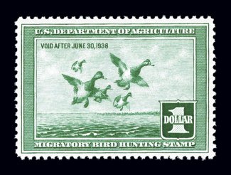 877 nh RW4 image#RW4, 1937 $1.00 Light green, precisely centered within large margins, striking rich color and an especially detailed impression on fresh paper, pristine o.g., n.h., extremely fine; a highly desirable stamp in this flawless quality; 2004 PF certificate. (Image) $300.00