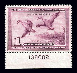 878 nh RW5 image#RW5, 1938 $1.00 Light violet, bottom sheet-margin plate no. 138602 single, possessing outstanding centering, rich color, o.g., n.h., typical natural gum wrinkles, extremely fine; clear 2000 PF certificate. (Image) $450.00