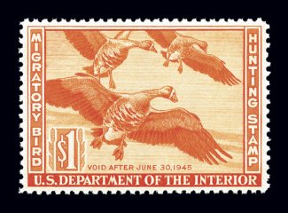 880 nh RW11 image#RW11, 1944 $1.00 Red orange, choice mint single, perfectly centered within large margins, vibrant color, o.g., n.h., an extremely fine gem; 2005 PSE certificate (XF-Superb 95). (Image) $110.00