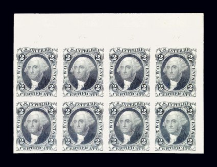 1000 TCbl R7TC4 image#R7TC4, 2c Certificate, ultramarine trial color plate proof on card, lovely top right corner margin block of eight in this distinctive ultramarine shade that sometimes was used for various values, large to huge margins all around, fresh and extremely fine; catalog value for eight singles. (Image) $520.00+