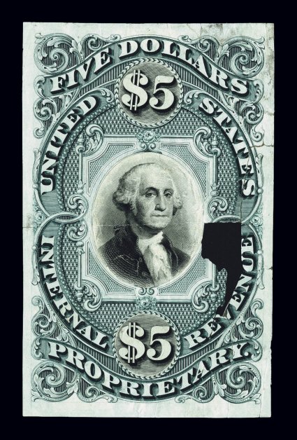 981 E Turner Essay 119 var. imageTurner Essay 119 var., $5.00 Dark blue green, model from this die essay of the frame on India paper with black cutouts of Washington vignette and "$5" on India pasted on, 68x108mm, both the frame and the cutouts are of the issued designs making a model of the completed design as issued, damaged with tears at right and a piece of the frame at right missing, nevertheless very rare and probably unique; unlisted in Turner and there was no example in Joyce. (Image) Est. 300-400