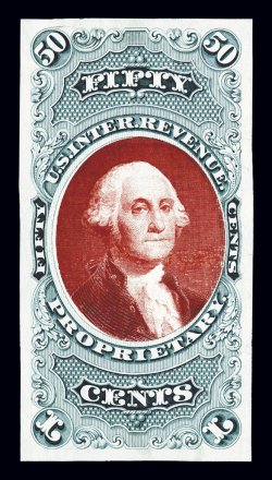 985 E R44TC Model image#R44TC Model, 25c Blue trial color proof, with black Washington vignette pasted on making a model of a different than issued design, on heavy bond paper, the basic proof is in the issued design with heavy shading behind Washington's head listed as a color proof in blue on bond paper in Scott (catalog value $300.00), the black vignette pasted over is with very little shading behind Washington's head and was never used on the First Issue revenues, this was done in production to see what different vignette designs looked like, clear to large margins, very fine and extremely rare; listed in Turner on page 72 under Experimental Papers, Models and Trial Colors. (Image) Est. 400-500