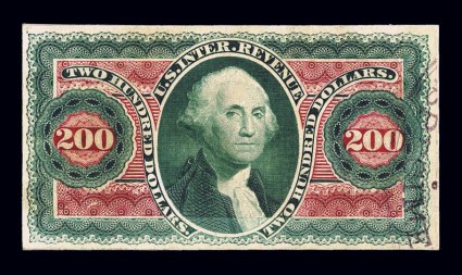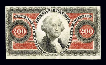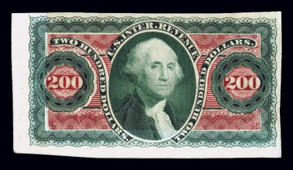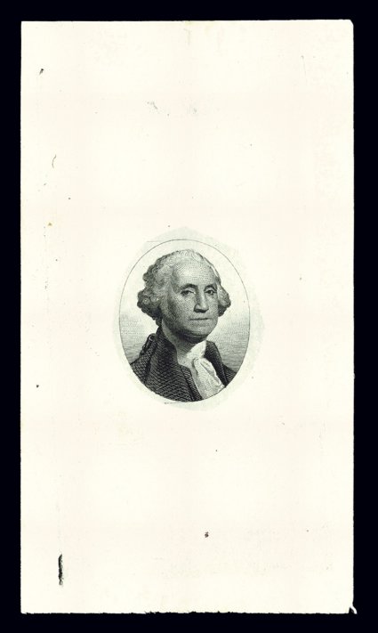 990 E Turner Essay 122B imageTurner Essay 122B, Washington Head shaded vignette (24x29mm), masked die essays in black and blackish green, on India paper, two essays showing the full die sinkage, measuring 98-108x67-73mm, sharp impression, each with tiny mounting thin in the extreme margins, otherwise very fine; this portrait was used on the $200.00 First Issue revenue. (Image) Est. 150-200