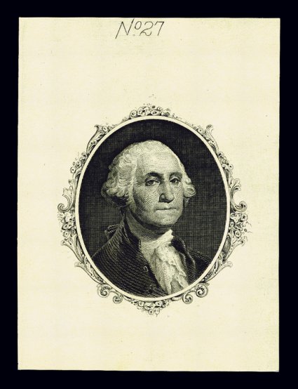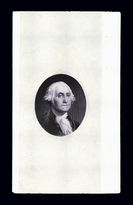 989 E imageWashington vignette die essay, in black on India paper, 43x48mm, this circular vignette that measures 22mm in diameter was used on certain of the dollar values of the Second and Third Issue revenues, very fine and rare; not listed in Turner; 1972 PF certificate. (Image) Est. 200-300