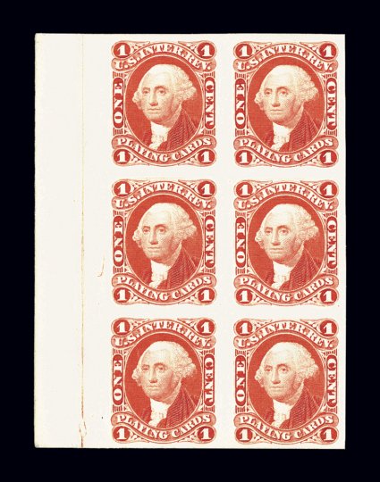 998 Pbl R2P4 image#R2P4, 1c Playing card, plate proof on card, attractive left sheet-margin block of six (2x3), other three margins are large to extra-large as well, very fresh with bright color, extremely fine. (Image) $390.00+