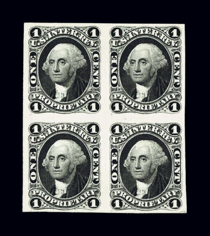 999 TCbl R3TC3 image#R3TC3, 1c Proprietary, black trial color plate proof on India on original card backing, block of four with large even margins all around, intense deep color on white paper, very fine and exceptionally choice; catalog value for four singles. (Image) $320.00+