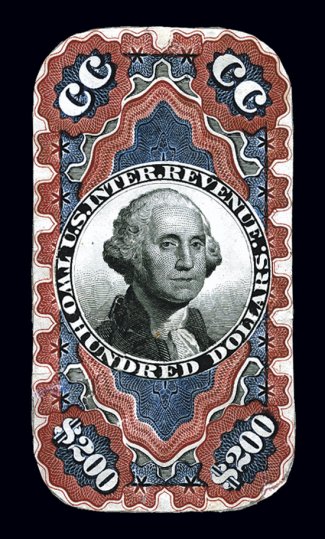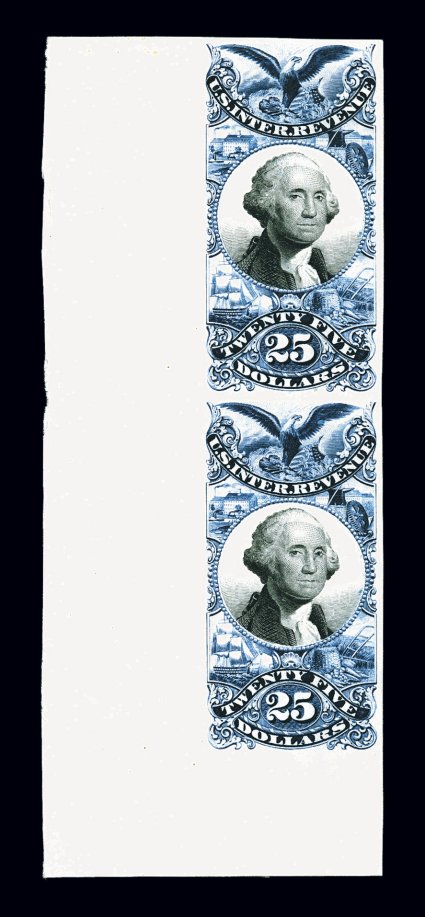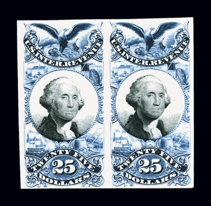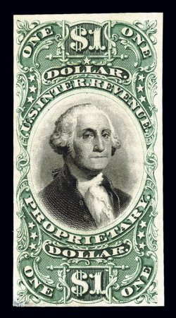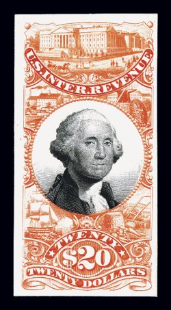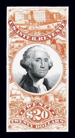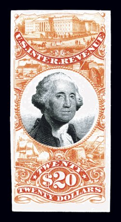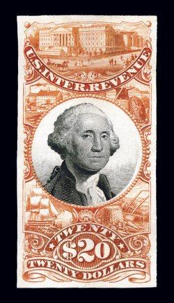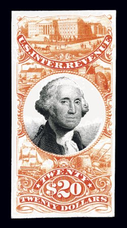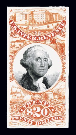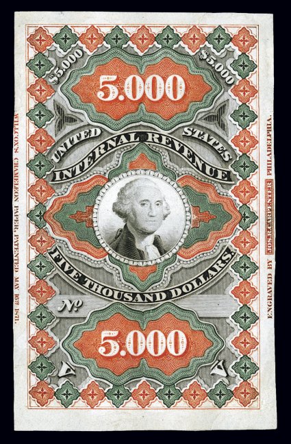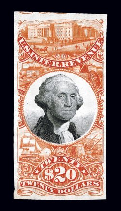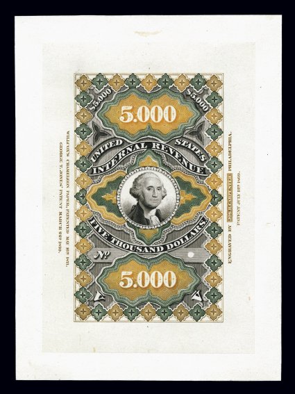 1067 TC R133ATC image#R133ATC (Turner Essay 110a), $5,000.00 Yellow orange, green and black, large die trial color proof on India, mounted on full 122x167mm card, with complete manufacturer's imprints at both left and right and security punch in the India, possessing truly outstanding freshness and cleanliness, with radiant rich colors on bright white papers, extremely fine.The $5,000.00 Internal Revenue stamp was actually designed and approved for production but was never issued. The only examples that are known of this value are in proof form, all but one being on India and largely in differing shades of the orange and green. The total known is twenty-five with ten residing in the National Postal Museum of the Smithsonian. Of the total only five examples have full imprints and of those only three are available to collectors. Two of those are in the yellow orange, green and black combination. The example offered here is the finer of the two and the finest of any $5,000 Revenue in private hands.An incomparable trial color proof of this highest denomination 19th century revenue stamp. Not only because of its extreme rarity, but also because of its pristine quality, this exquisite proof would certainly provide the centerpiece to a great collection of United States Revenues; 1991 PF certificate as a Turner Essay 110 from before it became listed in the Trial Color section of the Scott catalog; ex-Joyce. (Image) $7,500.00